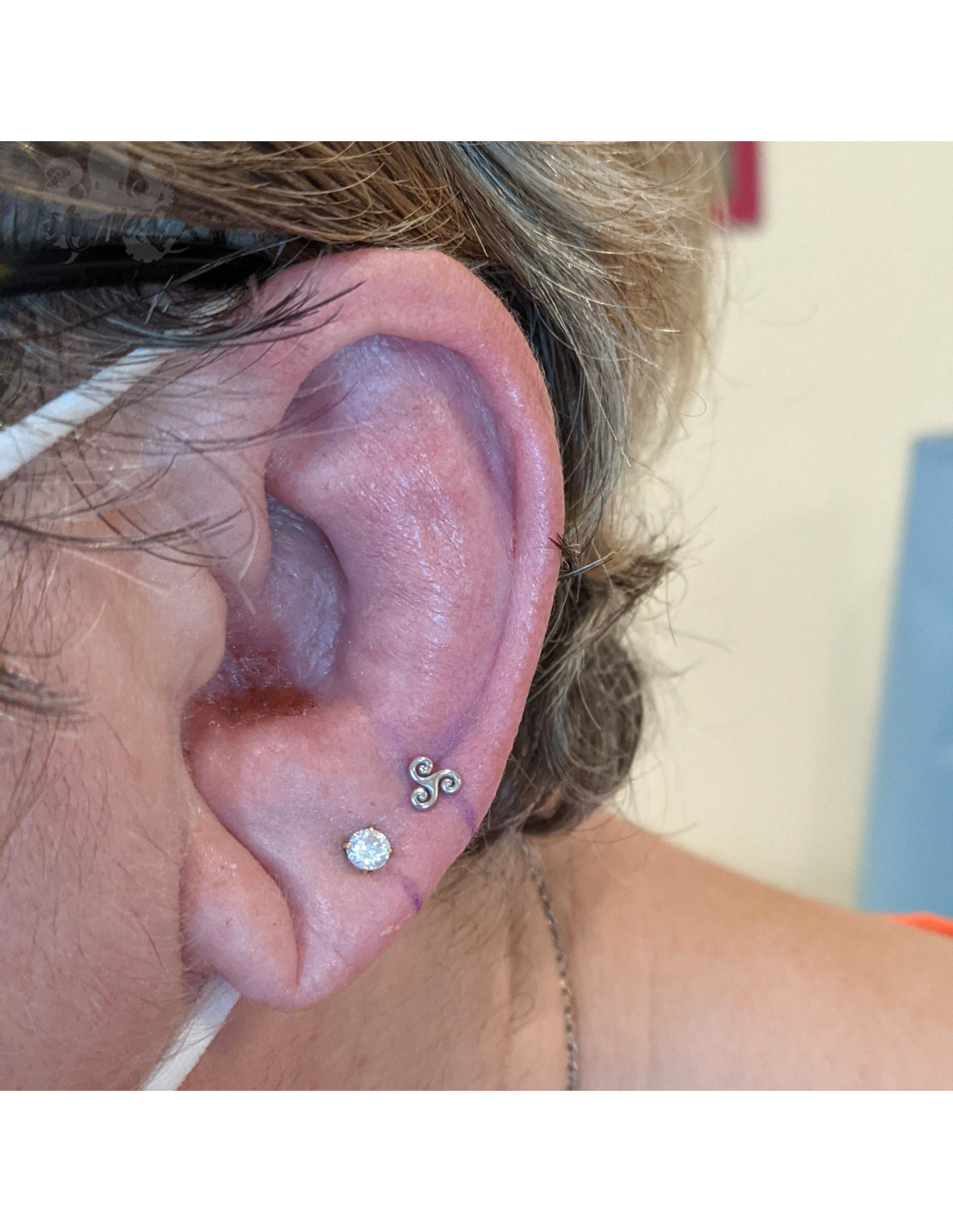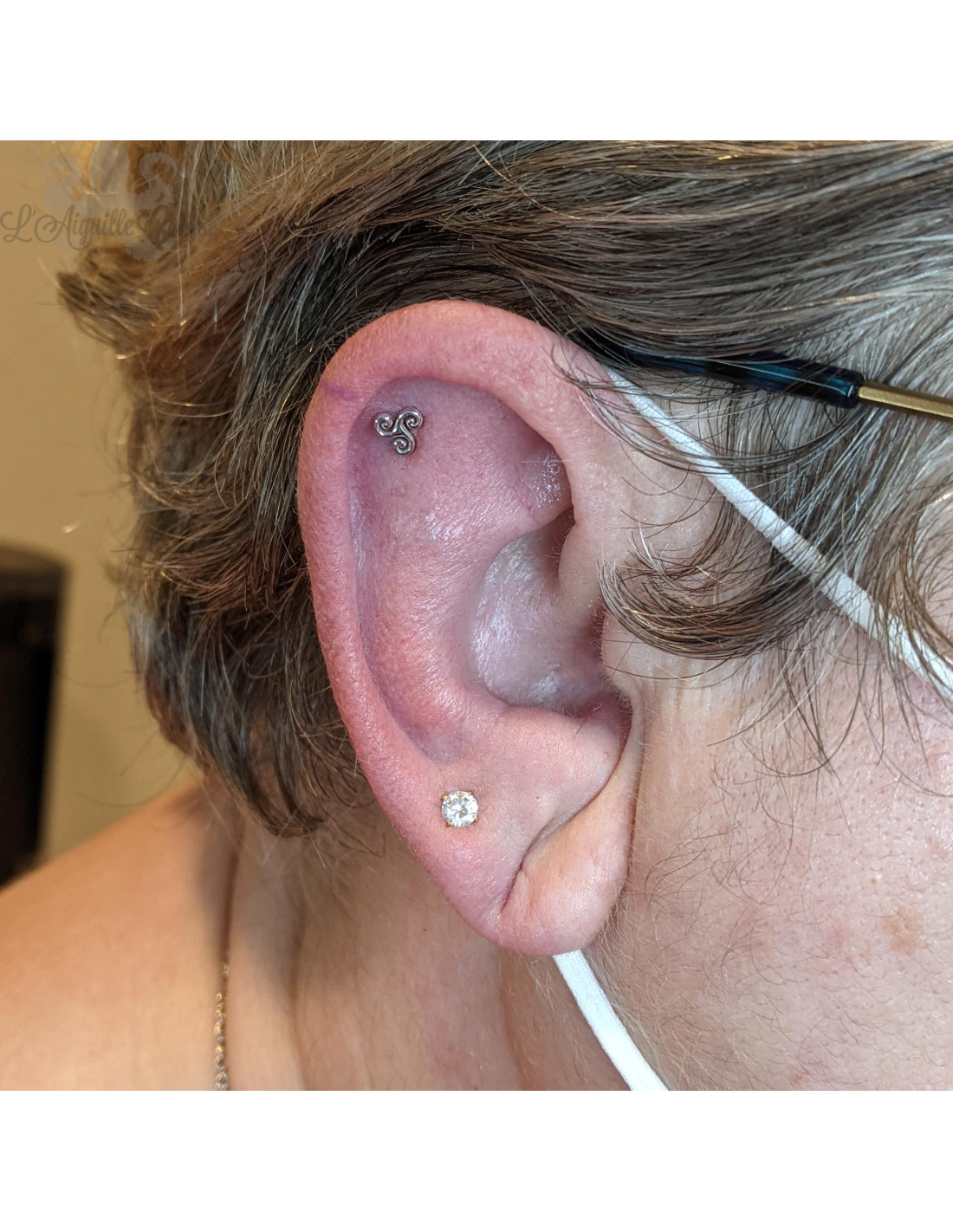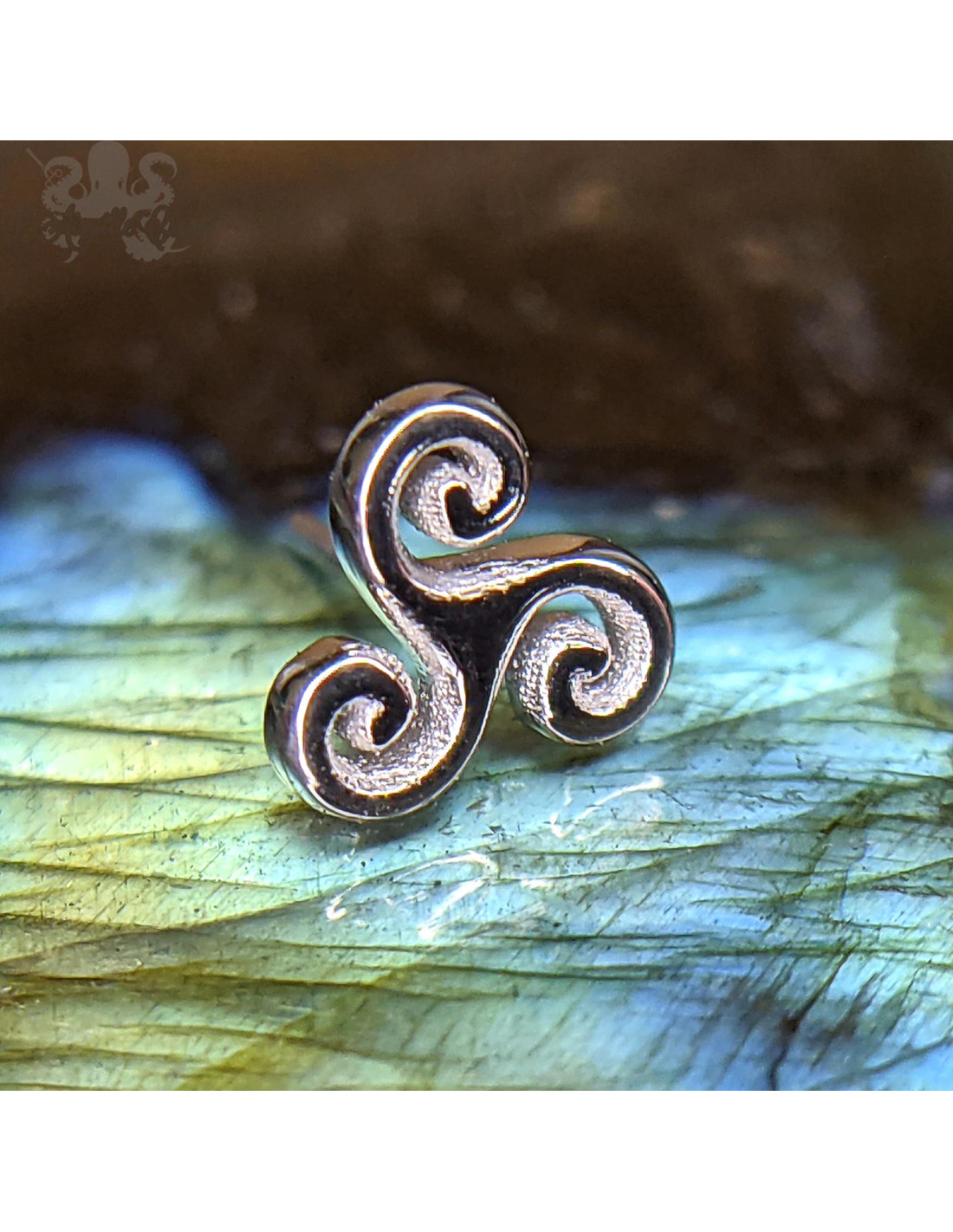 Triskèle or blanc 18 carats threadless. Il mesure 4.5 mm.