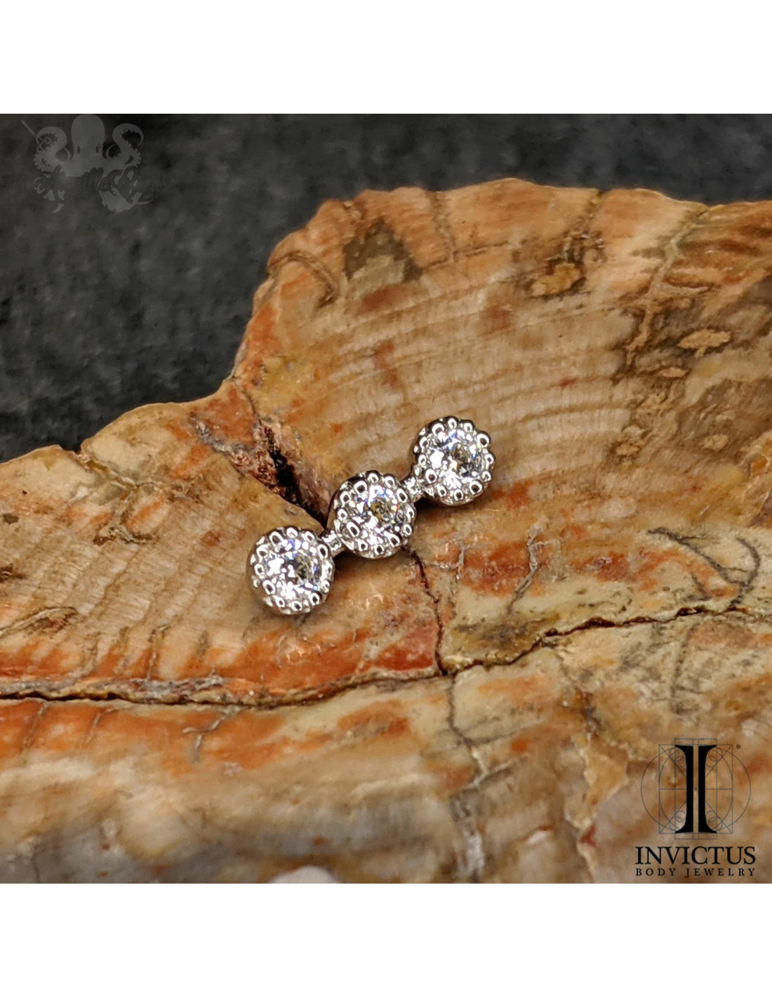 Accessoire threadless en or blanc 14 carats et zircons réalisé par la marque Invictus. Il mesure 8 mm par 2.6 mm.