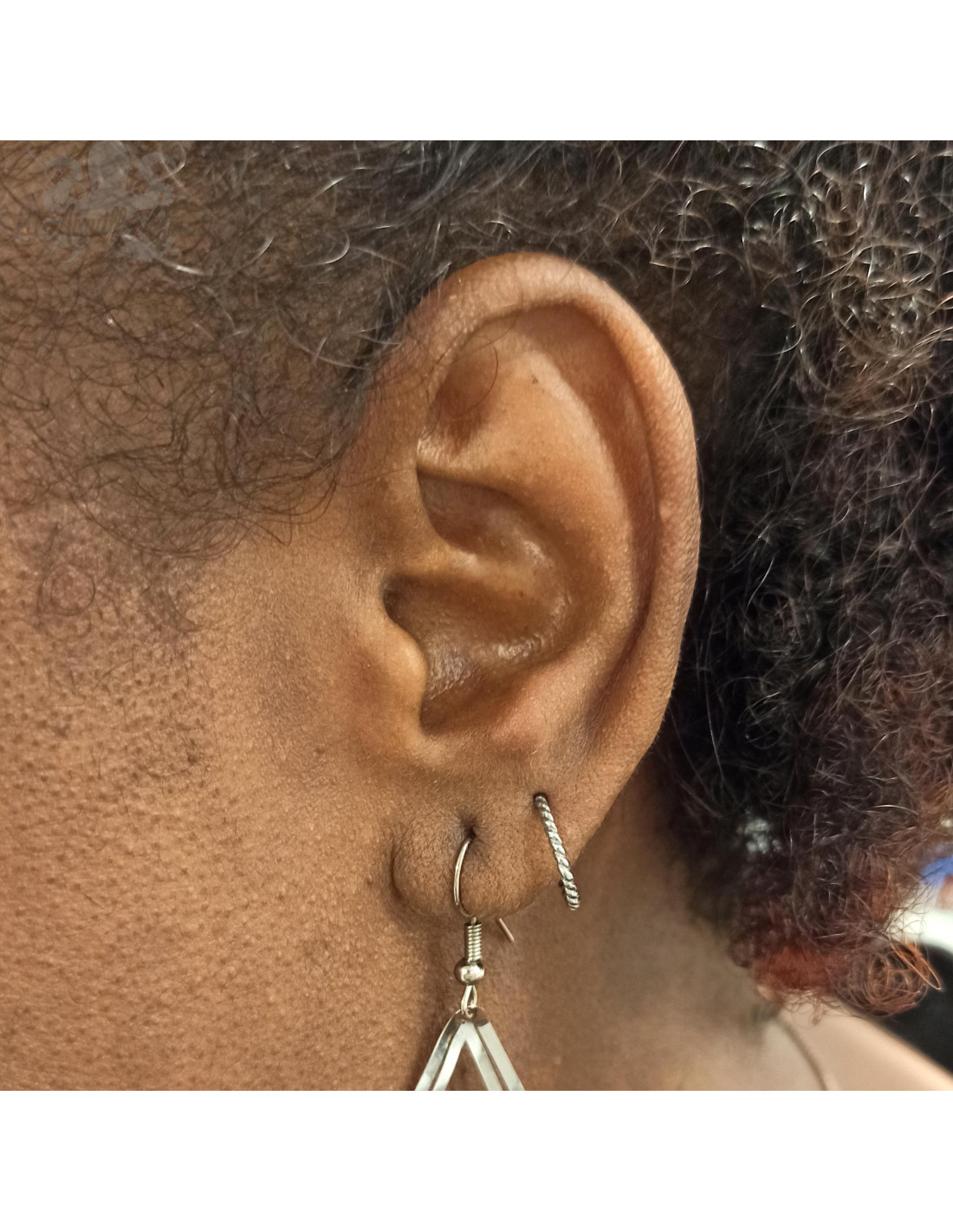 Accessoire QualiTi en titane implantable (ASTM F-136) et opales synthétiques. Il mesure 4.6 mm de longueur pour 1.2 mm de largeur.