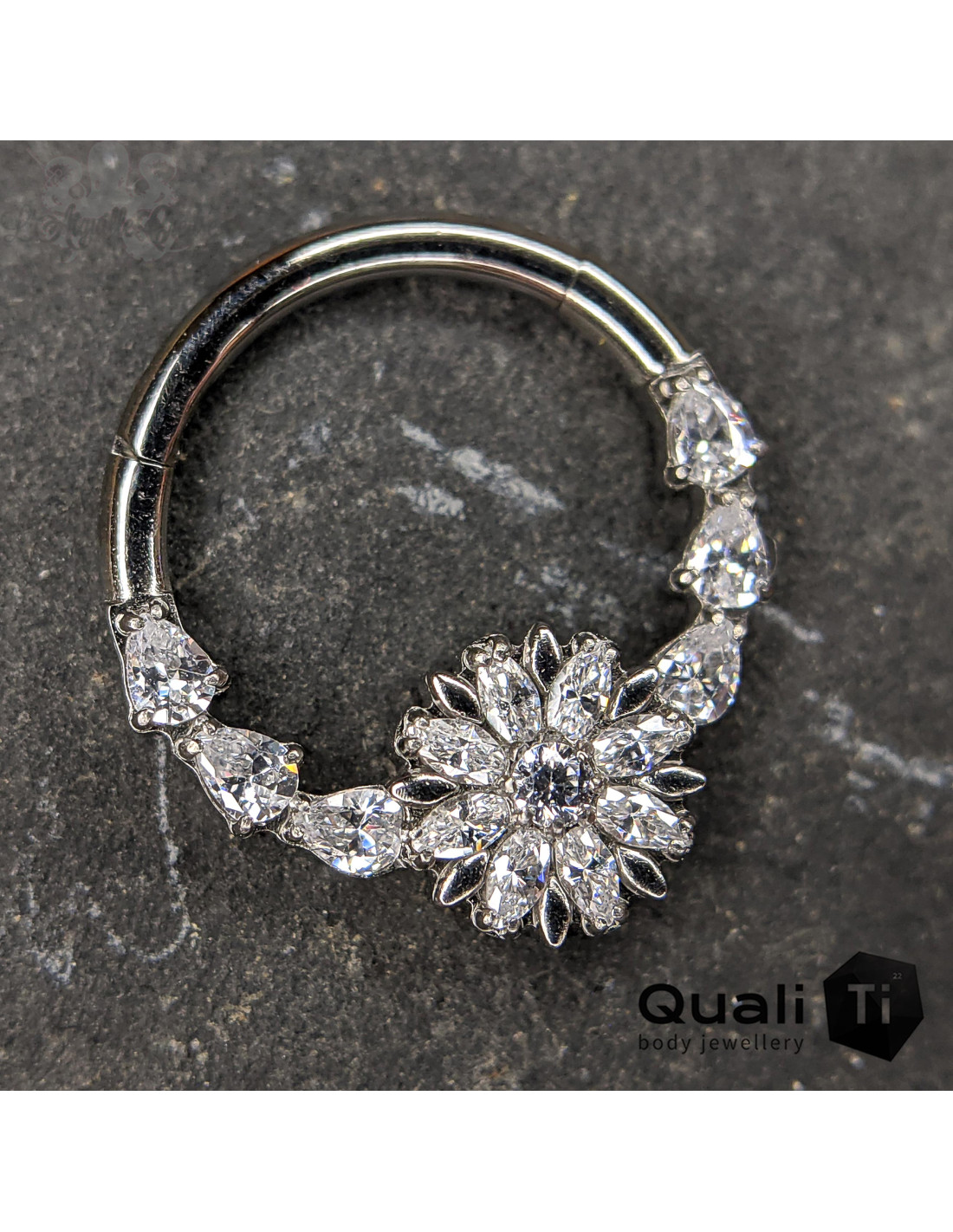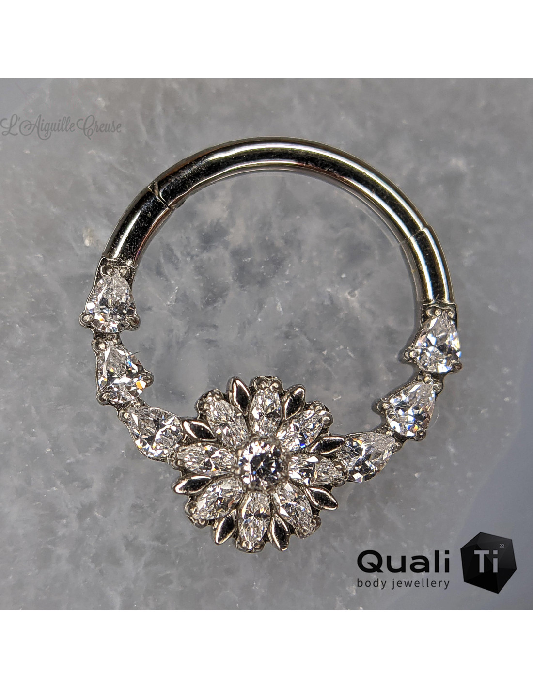 Accessoire threadless en or blanc 14 carats et zircons réalisé par la marque Invictus. Il mesure 8,5 mm par 14,3 mm.