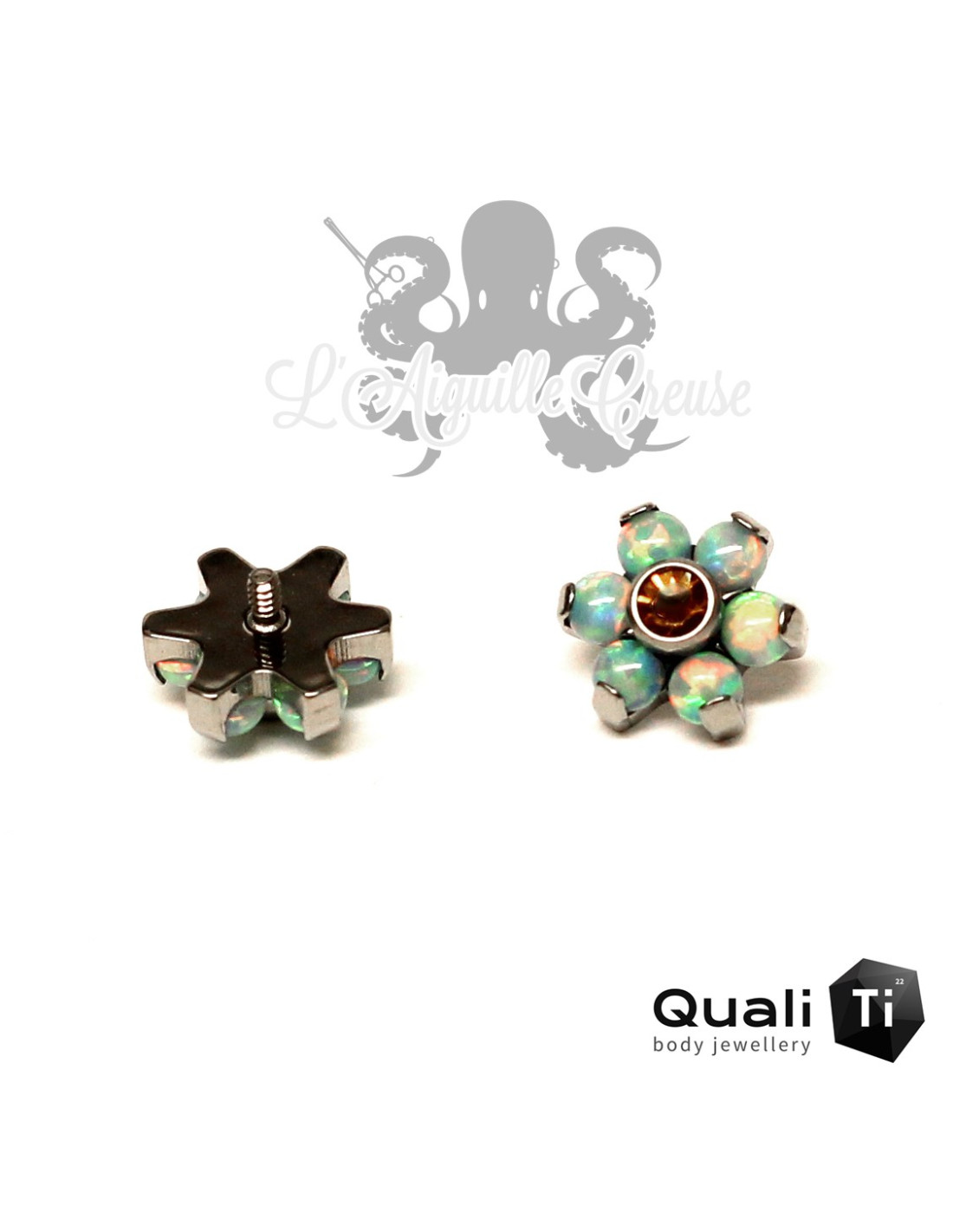 Fleur QualiTi de 6.7 mm, en titane implantable (ASTM F-136), zircon et opales synthétiques.