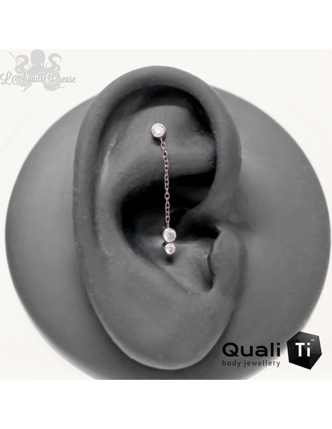 Accessoire QualiTi en titane implantable (ASTM F-136) et zircons premiums. La chainette mesure 18 mm de long.