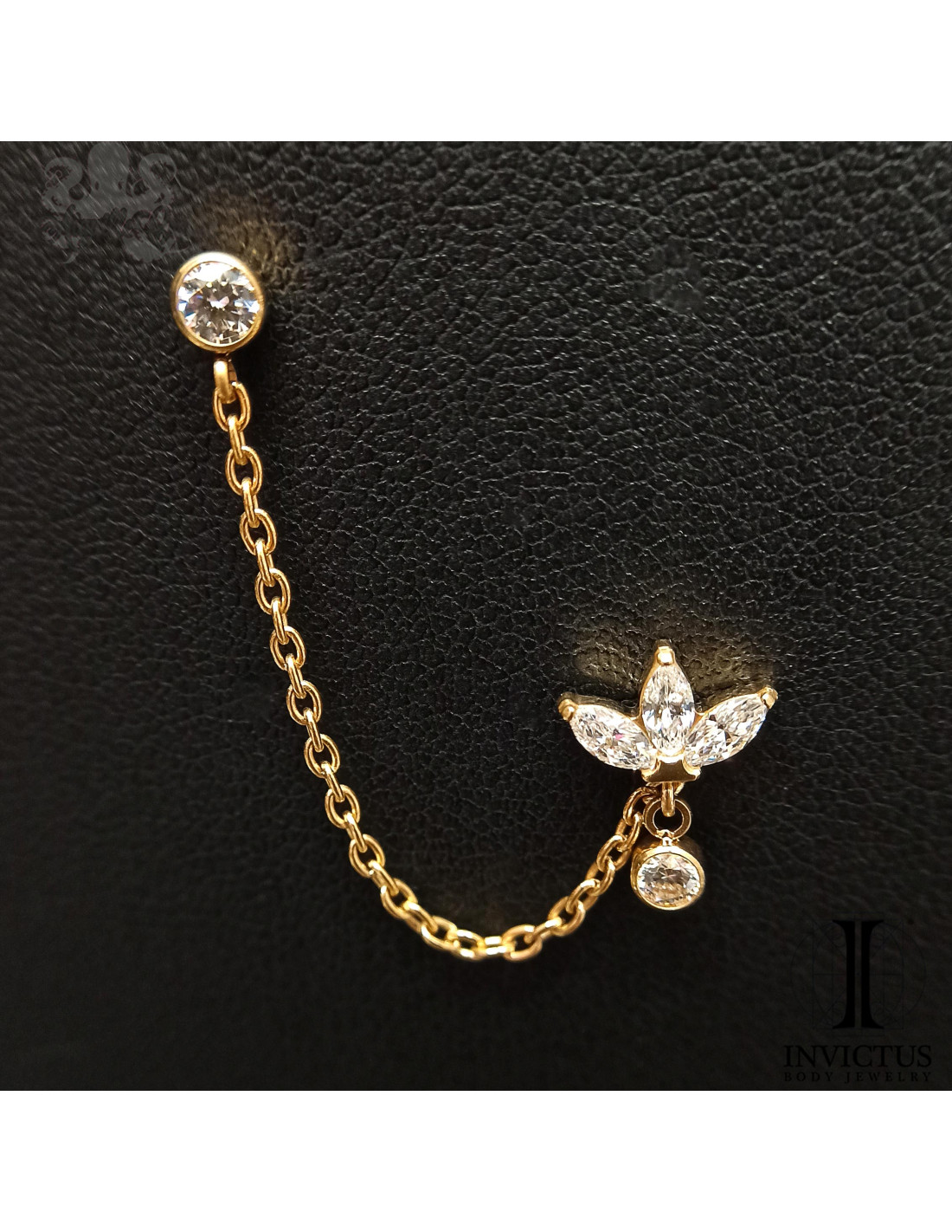 Double accessoires threadless en titane implantable (ASTM F-136) pvd gold orné de zircons premiums. Ils sont reliés par une chaine qui mesure 40 mm.