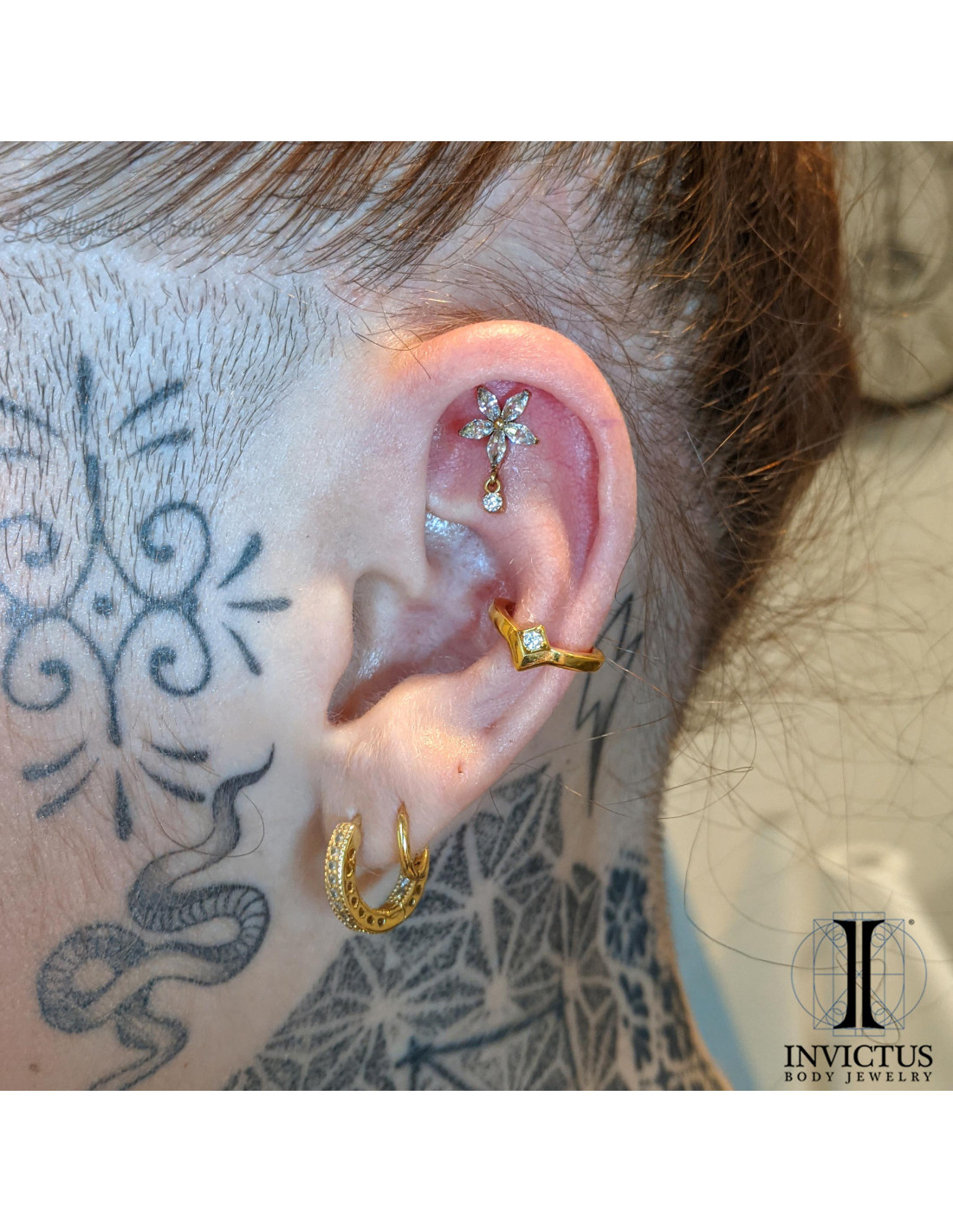 Fleur Invictus en titane pvd or 24 carats et zircons - threadless