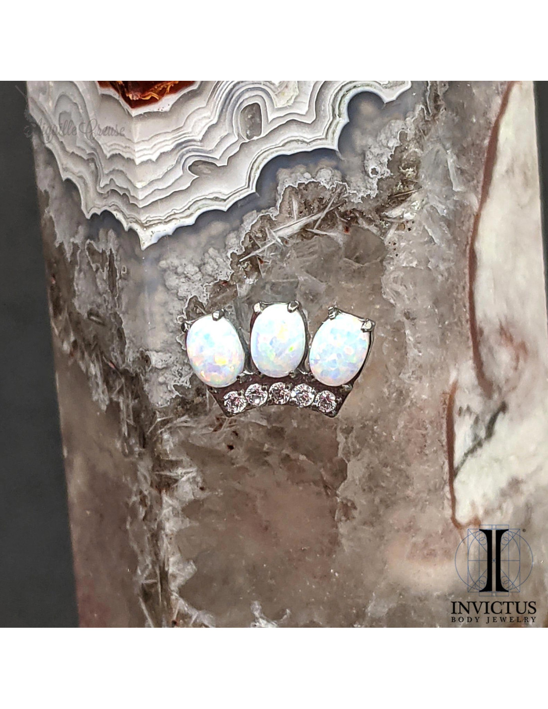 Cluster d'opales synthétiques et de zircons Invictus, en titane implantable (ASTM F-136). Il mesure 11mm.